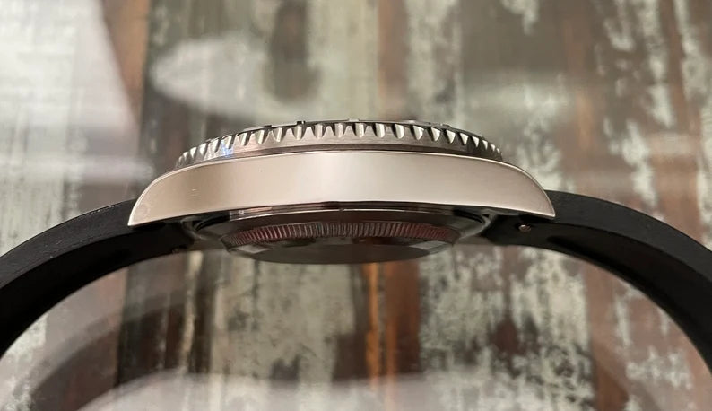 Tie Dye Dial Diver Wristwatch, frosted bezel. 40mm diameter, 47mm lug to lug, 20mm lug width. Case features sapphire glass, screw down crown, uni-directional ratcheting timer bezel, 10ATM. Genuine Seiko NH35 Movement. 41 hour power reserve, automatic and hand wind. Black FKM rubber strap with stainless steel buckle. All parts brand new.